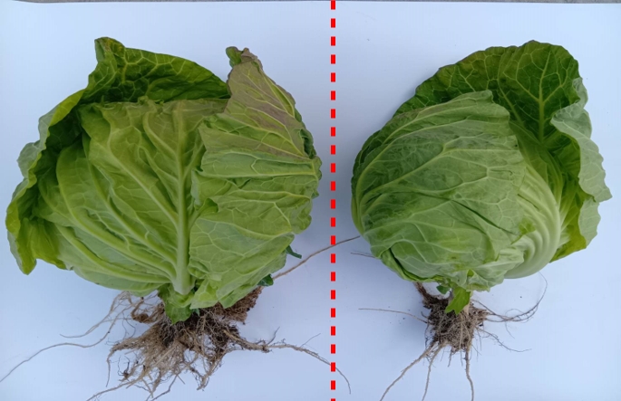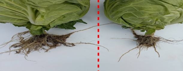 「ミネラル67」使用のキャベツの根張りが明らかに良い~生産者様の声~3年ほど前からキャベツに「ミネラル67」を使っているが、キャベツの形がきれいにできる。季節により差はあるが、安定して収穫できる。